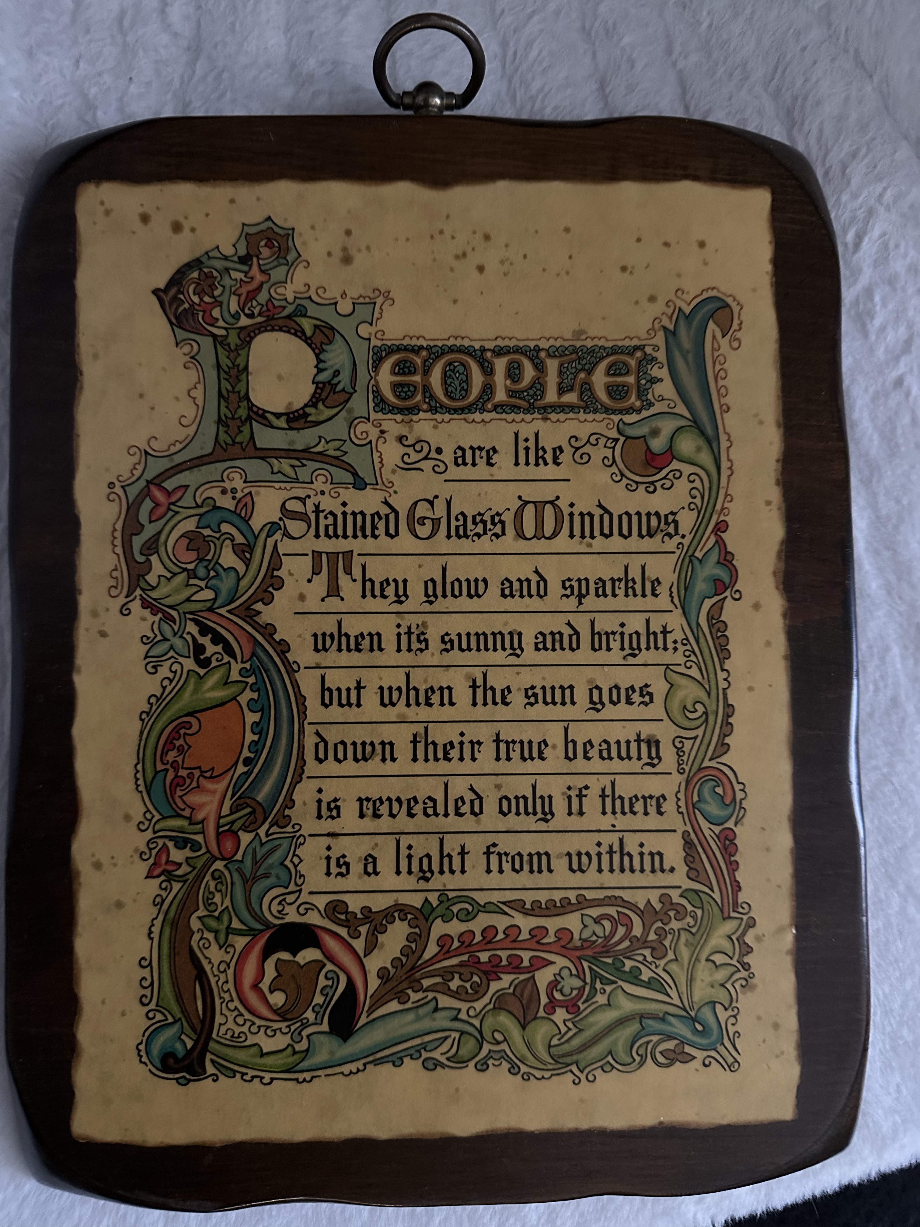 - Her plaque that used to hang in her home titled People. People are like glass windows. They glow and sparkle when it’s sunny and bright but when the sun goes down their true beauty is revealed only if there’s a light from within.